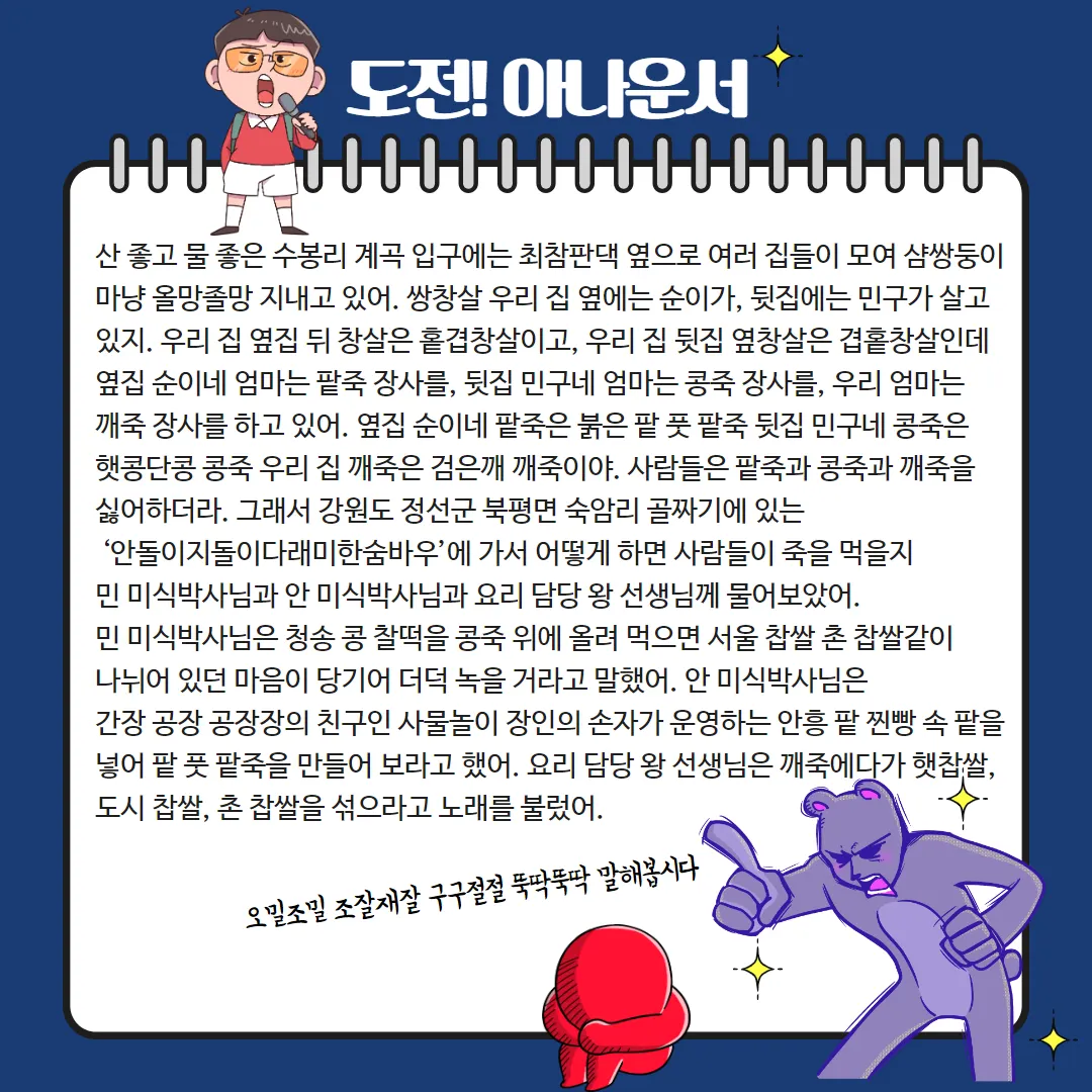 : 고난이도의 긴 문장 혹은 발음이 어려운 문장을 따라 읽고, 높은 포인트를 획득하는 콘텐츠입니다.